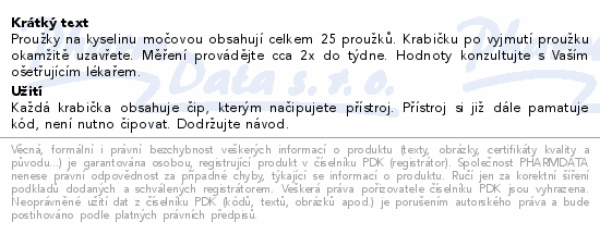 Proužky na kyselinu močovou obsahují celkem 25 proužků. Krabičku po vyjmutí proužku okamžitě uzavřete. Měření provádějte cca 2x do týdne. Hodnoty konzultujte s Vaším ošetřujícím lékařem.
