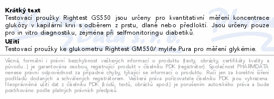 Testovací proužky Rightest GS550 jsou určeny pro kvantitativní měření koncentrace glukózy v kapilární krvi s odběrem z prstu, dlaně nebo předloktí. Jsou určeny pouze pro in vitro diagnostiku, zejména při selfmonitoringu diabetiků.