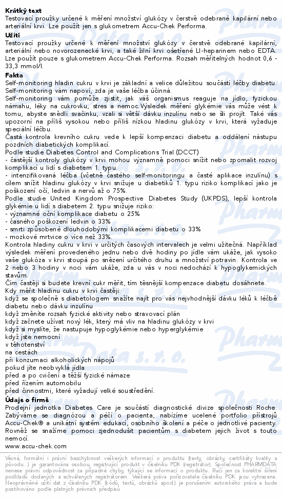 Testovací proužky určené k měření množství glukózy v čerstvě odebrané kapilární nebo arteriální krvi. Lze použít jen s glukometrem Accu-Chek Performa.