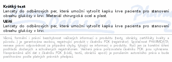 Lancety do odběrových per, která umožní vytvořit kapku krve pacienta pro stanovení obsahu glukózy v krvi. Materiál chirurgická ocel a plast.