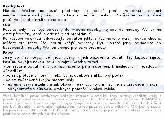 Nádoba Wellion na ostré předměty: je odolná proti propíchnutí, ochrání neinformované osoby před kontaktem s použitými jehlami. Používá se pro odložení použitých jehel z inzulínového pera.