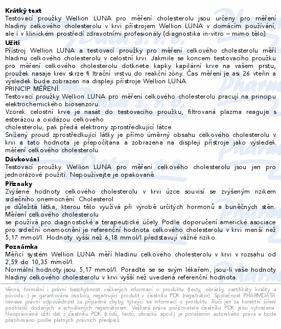 Testovací proužky Wellion LUNA pro měření cholesterolu jsou určeny pro měření hladiny celkového cholesterolu v krvi přístrojem Wellion LUNA v domácím používání, ale i v klinickém prostředí zdravotními profesionály (diagnostika in-vitro – mimo tělo).
