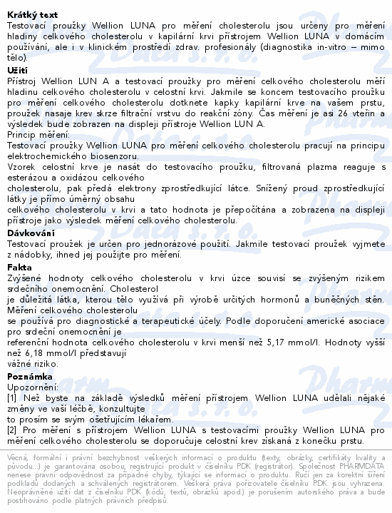 Testovací proužky Wellion LUNA pro měření cholesterolu jsou určeny pro měření hladiny celkového cholesterolu v kapilární krvi přístrojem Wellion LUNA v domácím používání, ale i v klinickém prostředí zdrav. profesionály (diagnostika in-vitro – mimo tělo).