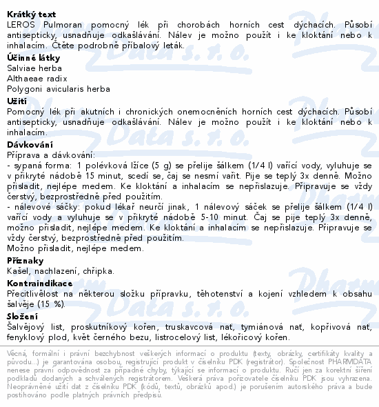 LEROS Pulmoran pomocný lék při chorobách horních cest dýchacích. Působí antisepticky, usnadňuje odkašlávání. Nálev je možno použít i ke kloktání nebo k inhalacím. Čtěte pozorně příbalový leták.