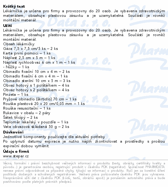 Lékárnička je určena pro firmy a provozovny do 20 osob. Je vybavena zdravotnickým materiálem, obsahuje plastovou zásuvku a je uzamykatelná. Součástí je rovněž montážní materiál.