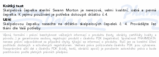Skalpelová čepelka sterilní Swann Morton je nerezová, velmi kvalitní, ostrá a pevná čepelka. K jejímu používání je potřeba dokoupit držátko č.4.