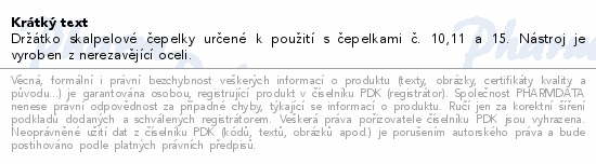 Držátko skalpelové čepelky určené k použití s čepelkami č. 10,11 a 15. Nástroj je vyroben z nerezavějící oceli.