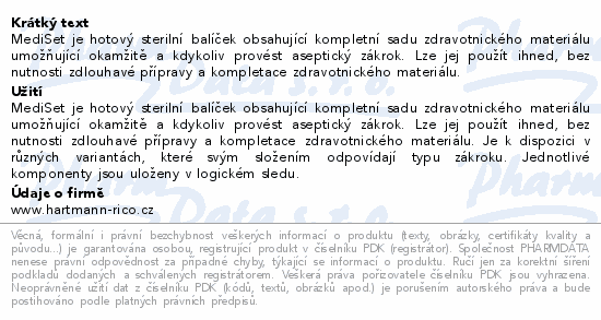 MediSet je hotový sterilní balíček obsahující kompletní sadu zdravotnického materiálu umožňující okamžitě a kdykoliv provést aseptický zákrok. Lze jej použít ihned, bez nutnosti zdlouhavé přípravy a kompletace zdravotnického materiálu.