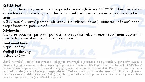 Nůžky do lékárničky se sklonem odpovídají nové vyhlášce č.283/2009. Slouží ke stříhání zdravotnického materiálu, nebo třeba i k přestřižení bezpečnostního pásu ve vozidle.