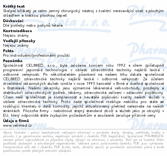 Skalpel bříškatý je velmi jemný chirurgický nástroj z kvalitní nerezavějící oceli s plochým držadlem a krátkou plochou čepelí.