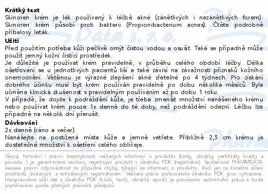 Skinoren krém je lék používaný k léčbě akné (zánětlivých i nezánětlivých forem). Skinoren krém působí proti bakterii (Propionibacterium acnes). Čtěte pozorně příbalový leták.