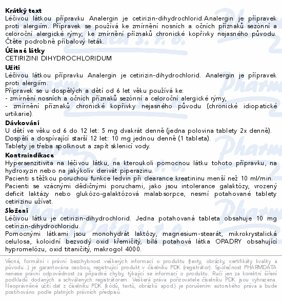 Léčivou látkou přípravku Analergin je cetirizin-dihydrochlorid.Analergin je přípravek proti alergiím. Přípravek se používá ke zmírnění nosních a očních příznaků sezónní a celoroční alergické rýmy; ke zmírnění příznaků chronické kopřivky nejasného původu. Čtěte pozorně příbalový leták.