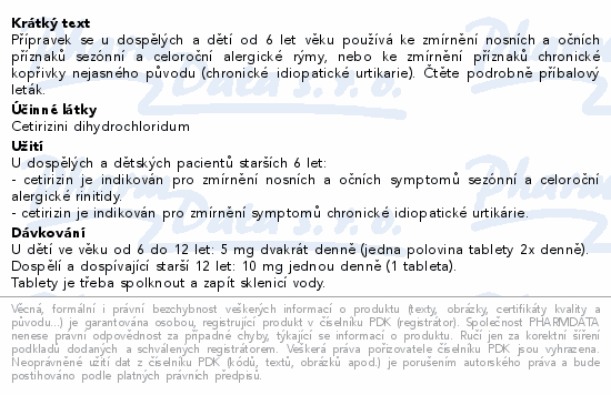 Přípravek se u dospělých a dětí od 6 let věku používá ke zmírnění nosních a očních příznaků sezónní a celoroční alergické rýmy, nebo ke zmírnění příznaků chronické kopřivky nejasného původu (chronické idiopatické urtikarie). Čtěte pozorně příbalový leták.