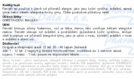Fenistil se používá k úlevě od příznaků alergie, jako jsou kožní vyrážka, svědění, senná rýma nebo ostatní alergické formy rýmy. Čtěte pozorně příbalový leták.