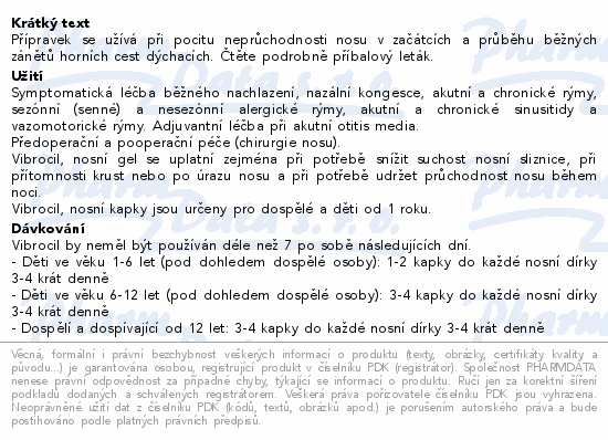 VIBROCIL 2,5MG/ML+0,25MG/ML nosní kapky při léčbě rýmy 15ml Vibrocil poskytuje rychlou úlevu od překrvení nosní sliznice a tekoucí rýmy způsobené celou řadou infekčních nebo alergických onemocnění horních cest dýchacích. Vibrocil tlumí nadměrnou nosní sekreci a čistí nos a neovlivňuje aktivitu nosních řasinek. Vibrocil se používá k úlevě od ucpaného nosu v případě nachlazení, akutní a chronické rýmy, senné rýmy nebo jiné alergické rýmy (alergie na prach, zvířecí srst atd.), vazomotorické rýmy a zánětu vedlejších nosních dutin (sinusitidě). Vibrocil může být také používán jako doplňková léčba v případě zánětu středního ucha. Vibrocil nosní kapky jsou určeny pro dospělé, dospívající a děti od 1 roku.