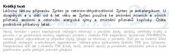 Léčivou látkou přípravku Zyrtec je cetirizin-dihydrochlorid. Zyrtec je antialergikum. U dospělých a u dětí od 6 let věku se Zyrtec používá ke zmírnění nosních a očních příznaků sezónní a celoroční alergické rýmy a zmírnění příznaků kopřivky. Čtěte pozorně příbalový leták.
