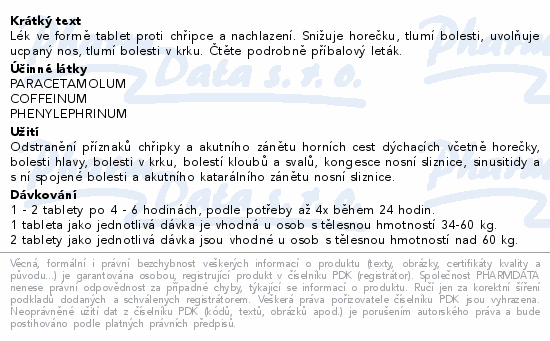 Lék ve formě tablet proti chřipce a nachlazení. Snižuje horečku, tlumí bolesti, uvolňuje ucpaný nos, tlumí bolesti v krku. Čtěte pozorně příbalový leták.