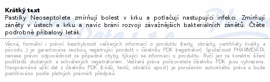 Pastilky Neoseptolete zmírňují bolest v krku a potlačují nastupující infekci. Zmírňují záněty v ústech a krku a navíc brání rozvoji závažnějších bakteriálních zánětů. Čtěte pozorně příbalový leták.