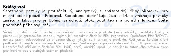 Septabene pastilky je protizánětlivý, analgetický a antiseptický léčivý přípravek pro místní orální použití. Přípravek Septabene dezinfikuje ústa a krk a zmírňuje příznaky zánětu v krku, jako je bolest, zarudnutí, otok, pocit tepla a porucha funkce. Čtěte pozorně příbalový leták.