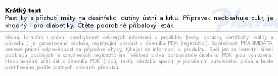 Pastilky s příchutí máty na desinfekci dutiny ústní a krku. Přípravek neobsahuje cukr, je vhodný i pro diabetiky. Čtěte pozorně příbalový leták.