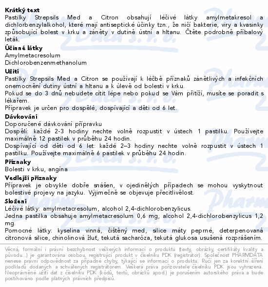 Pastilky Strepsils Med a Citron obsahují léčivé látky amylmetakresol a dichlorbenzylalkohol, které mají antiseptické účinky tzn., že ničí bakterie, viry a kvasinky způsobující bolest v krku a záněty v dutině ústní a hltanu. Čtěte pozorně příbalový leták.