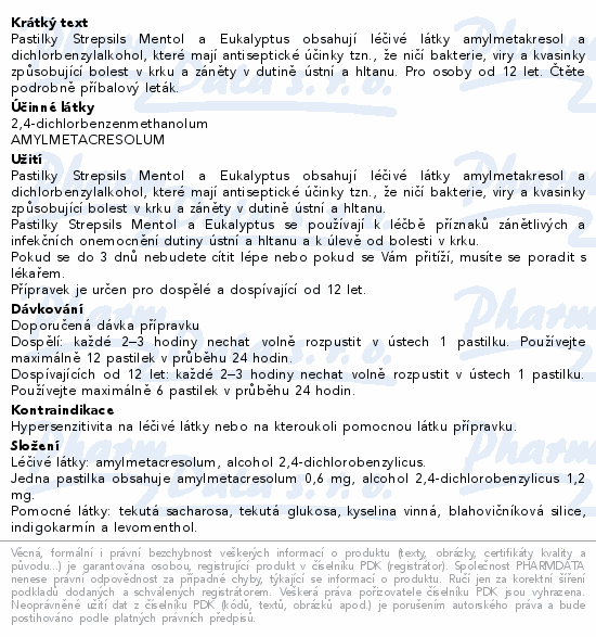 Pastilky Strepsils Mentol a Eukalyptus obsahují léčivé látky amylmetakresol a dichlorbenzylalkohol, které mají antiseptické účinky tzn., že ničí bakterie, viry a kvasinky způsobující bolest v krku a záněty v dutině ústní a hltanu. Pro osoby od 12 let. Čtěte pozorně příbalový leták.