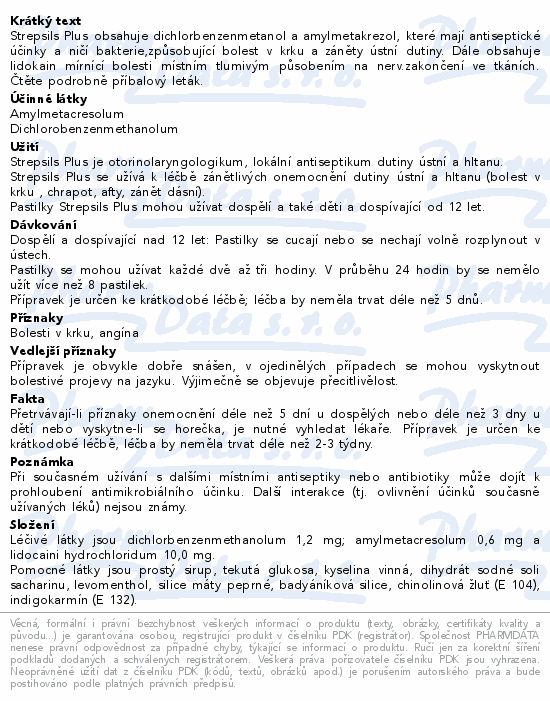 Strepsils Plus obsahuje dichlorbenzenmetanol a amylmetakrezol, které mají antiseptické účinky a ničí bakterie,způsobující bolest v krku a záněty ústní dutiny. Dále obsahuje lidokain mírnící bolesti místním tlumivým působením na nerv.zakončení ve tkáních. Čtěte pozorně příbalový leták.
