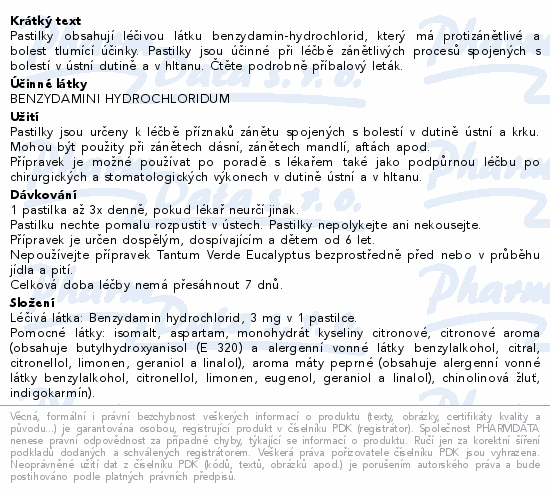 Pastilky obsahují léčivou látku benzydamin-hydrochlorid, který má protizánětlivé a bolest tlumící účinky. Pastilky jsou účinné při léčbě zánětlivých procesů spojených s bolestí v ústní dutině a v hltanu. Čtěte pozorně příbalový leták.