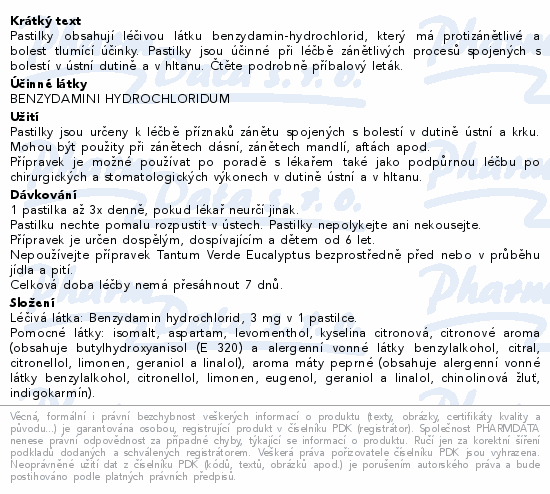 Pastilky obsahují léčivou látku benzydamin-hydrochlorid, který má protizánětlivé a bolest tlumící účinky. Pastilky jsou účinné při léčbě zánětlivých procesů spojených s bolestí v ústní dutině a v hltanu. Čtěte pozorně příbalový leták.
