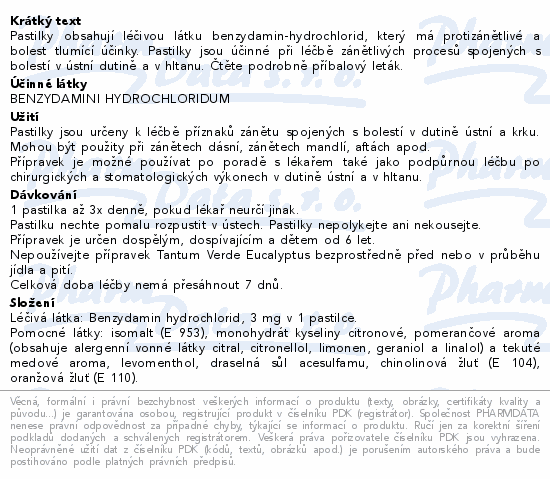 Pastilky obsahují léčivou látku benzydamin-hydrochlorid, který má protizánětlivé a bolest tlumící účinky. Pastilky jsou účinné při léčbě zánětlivých procesů spojených s bolestí v ústní dutině a v hltanu. Čtěte pozorně příbalový leták.
