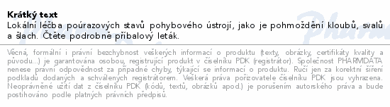 Lokální léčba poúrazových stavů pohybového ústrojí, jako je pohmoždění kloubů, svalů a šlach. Čtěte pozorně příbalový leták.