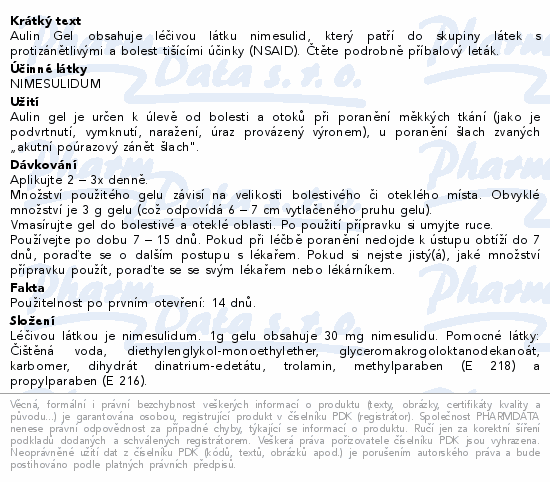 Aulin Gel obsahuje léčivou látku nimesulid, který patří do skupiny látek s protizánětlivými a bolest tišícími účinky (NSAID). Čtěte pozorně příbalový leták.