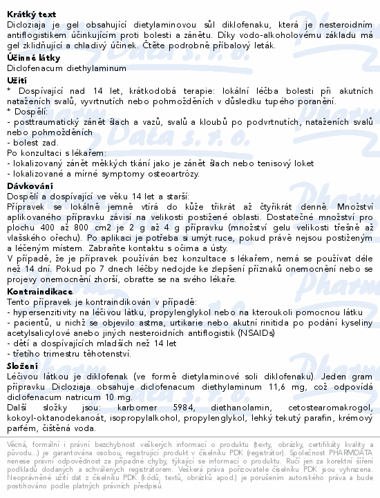 Dicloziaja je gel obsahující dietylaminovou sůl diklofenaku, která je nesteroidním antiflogistikem účinkujícím proti bolesti a zánětu. Díky vodo-alkoholovému základu má gel zklidňující a chladivý účinek. Čtěte pozorně příbalový leták.