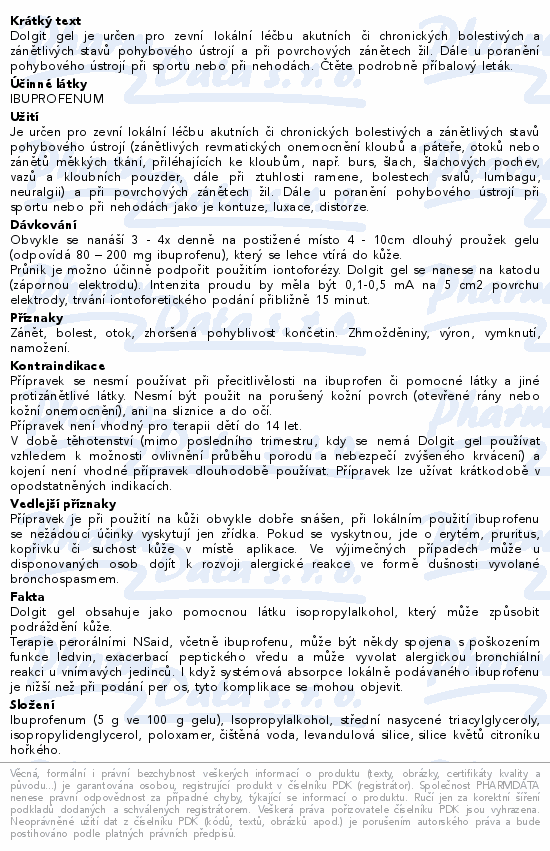 Dolgit gel je určen pro zevní lokální léčbu akutních či chronických bolestivých a zánětlivých stavů pohybového ústrojí a při povrchových zánětech žil. Dále u poranění pohybového ústrojí při sportu nebo při nehodách. Čtěte pozorně příbalový leták.