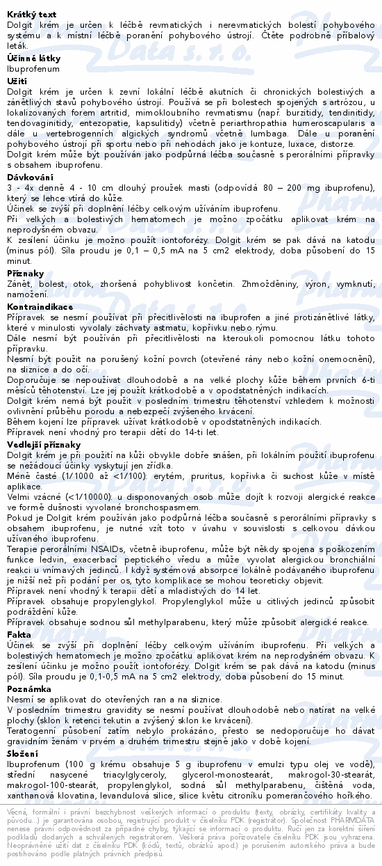 Dolgit krém je volně prodejný léčivý přípravek určený k lokální léčbě bolesti a zánětů pohybového aparátu. Jeho hlavní účinnou látkou je ibuprofen, který má analgetické (proti bolesti) a protizánětlivé účinky.