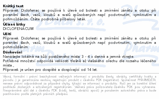 Přípravek Diclofenac se používá k úlevě od bolesti a zmírnění zánětu a otoku při poranění šlach, vazů, kloubů a svalů způsobených např. podvrtnutím, vymknutím a pohmožděním. Čtěte pozorně příbalový leták.