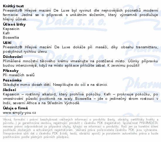 Priessnitz® Hřejivé mazání De Luxe byl vyvinut dle nejnovějších poznatků moderní farmacie. Jedná se o přípravek s unikátním složením, který významně prodlužuje hřejivý účinek.
