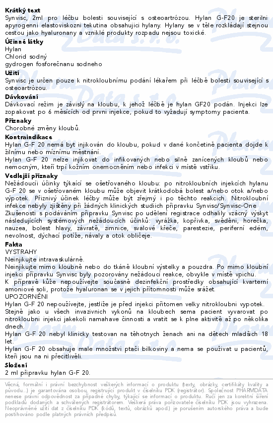 Synvisc, 2ml pro léčbu bolesti související s osteoartrózou. Hylan G-F20 je sterilni apyrogenni elastoviskozni tekutina obsahujici hylany. Hylany se v těle rozkládají stejnou cestou jako hyaluronany a vzniklé produkty rozpadu nejsou toxické.