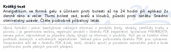Analgetikum ve formě gelu s účinkem proti bolesti až na 24 hodin při aplikaci 2x denně ráno a večer. Tlumí bolest zad, svalů a kloubů, působí proti zánětu. Snadno otevíratelný uzávěr. Čtěte pozorně příbalový leták.