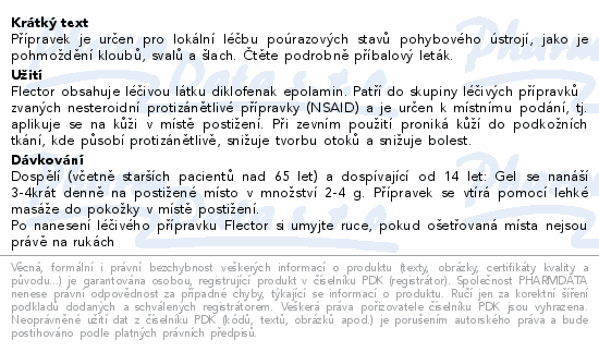Flector obsahuje léčivou látku diklofenak epolamin. Patří do skupiny léčivých přípravků zvaných nesteroidní protizánětlivé přípravky (NSAID) a je určen k místnímu podání, tj. aplikuje se na kůži v místě postižení. Při zevním použití proniká kůží do podkožních tkání, kde působí protizánětlivě, snižuje tvorbu otoků a snižuje bolest. Přípravek se používá u těchto stavů: