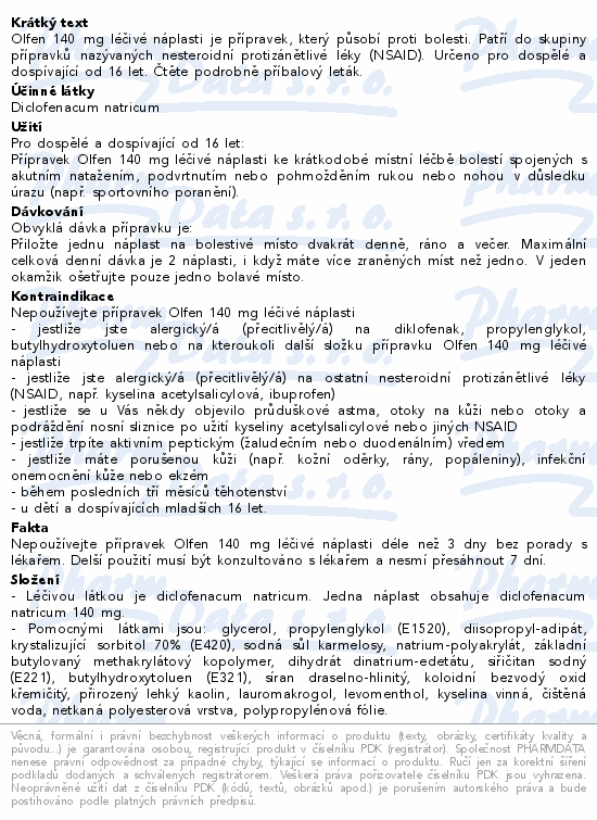 Olfen 140 mg léčivé náplasti je přípravek, který působí proti bolesti. Patří do skupiny přípravků nazývaných nesteroidní protizánětlivé léky (NSAID). Určeno pro dospělé a dospívající od 16 let. Čtěte pozorně příbalový leták. DLOUHOTRVAJÍCÍ ÚČINEK A EXTRA KOMFORT Úleva od bolesti svalů a kloubů končetin Kontinuální účinek po dobu 12 h Používají se ke krátkodobé léčbě bolesti při akutním natažení, podvrtnutí nebo zhmoždění končetin v důsledku zranění, např. při sportovních úrazech. Tento lék mohou používat dospělí a dospívající od věku 16 let. Jak funguje? Účinná látka diklofenak po aplikaci na kůži proniká do kožního depa, ze kterého se postupně uvolňuje, což umožňuje její působení po dobu až 12 hodin. Náplast tak stačí aplikovat pouze 2x denně.