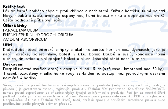 Lék ve formě horkého nápoje proti chřipce a nachlazení. Snižuje horečku, tlumí bolesti hlavy, kloubů a svalů, uvolňuje ucpaný nos, tlumí bolesti v krku a doplňuje vitamin C. Čtěte pozorně příbalový leták.
