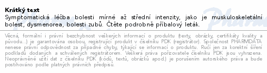 Symptomatická léčba bolesti mírné až střední intenzity, jako je muskuloskeletální bolest, dysmenorea, bolesti zubů. Čtěte pozorně příbalový leták.