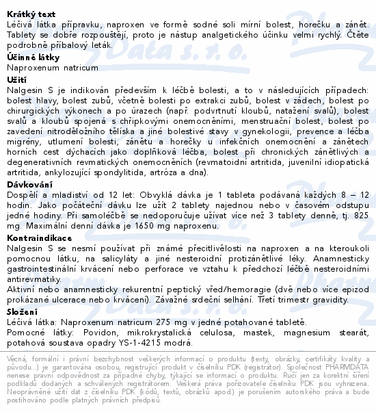 Nalgesin S 275 mg potahované tablety obsahují naproxenum-natrium, který patří mezi nesteroidní protizánětlivé léky (NSAID). Účinkuje proti bolesti, zánětu a horečce. Používá se ke krátkodobé úlevě od mírné až středně silné bolesti, například bolesti hlavy, zubů, zad, svalů a kloubů, bolesti při menstruaci nebo při horečce spojené s nachlazením či chřipkovými onemocněními.