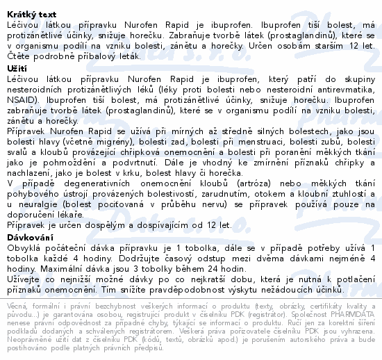 Léčivou látkou přípravku Nurofen Rapid je ibuprofen. Ibuprofen tiší bolest, má protizánětlivé účinky, snižuje horečku. Zabraňuje tvorbě látek (prostaglandinů), které se v organismu podílí na vzniku bolesti, zánětu a horečky. Určen osobám starším 12 let. Čtěte pozorně příbalový leták.
