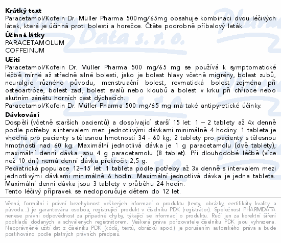 Paracetamol/Kofein Dr. Müller Pharma 500mg/65mg obsahuje kombinaci dvou léčivých látek, která je účinná proti bolesti a horečce. Čtěte pozorně příbalový leták.
