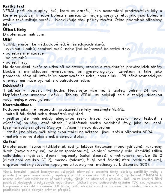 VERAL patří do skupiny léků, které se označují jako nesteroidní protizánětlivé léky a které se používají k léčbě bolesti a zánětu. Zmírňuje projevy zánětu, jako jsou bolest a otok a také snižuje horečku. Neovlivňuje však příčiny zánětu. Čtěte pozorně příbalový leták.