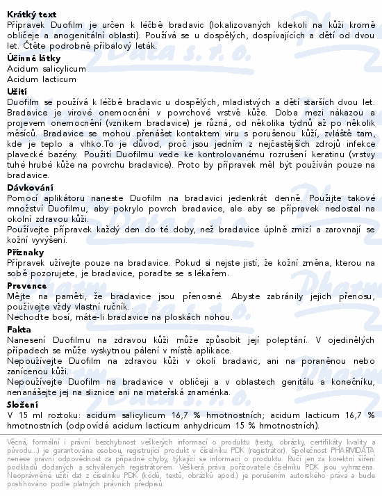 Přípravek Duofilm je určen k léčbě bradavic (lokalizovaných kdekoli na kůži kromě obličeje a anogenitální oblasti). Používá se u dospělých, dospívajících a dětí od dvou let. Čtěte pozorně příbalový leták.