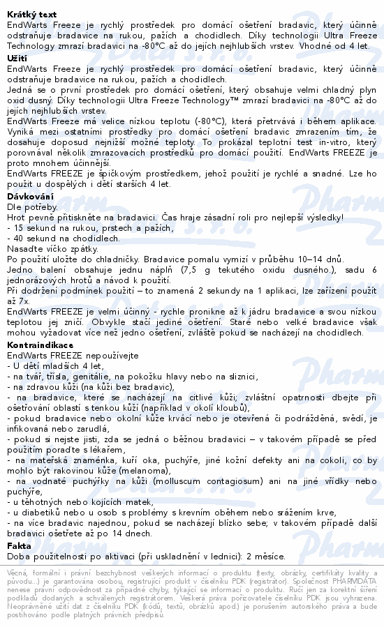 EndWarts Freeze je rychlý prostředek pro domácí ošetření bradavic, který účinně odstraňuje bradavice na rukou, pažích a chodidlech. Díky technologii Ultra Freeze Technology zmrazí bradavici na -80°C až do jejích nejhlubších vrstev. Vhodné od 4 let.