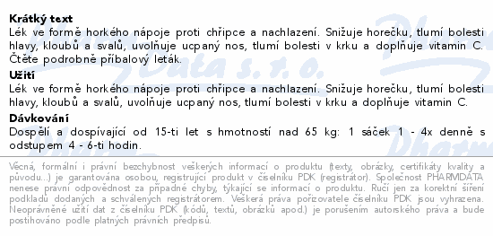 Lék ve formě horkého nápoje proti chřipce a nachlazení. Snižuje horečku, tlumí bolesti hlavy, kloubů a svalů, uvolňuje ucpaný nos, tlumí bolesti v krku a doplňuje vitamin C. Čtěte pozorně příbalový leták.